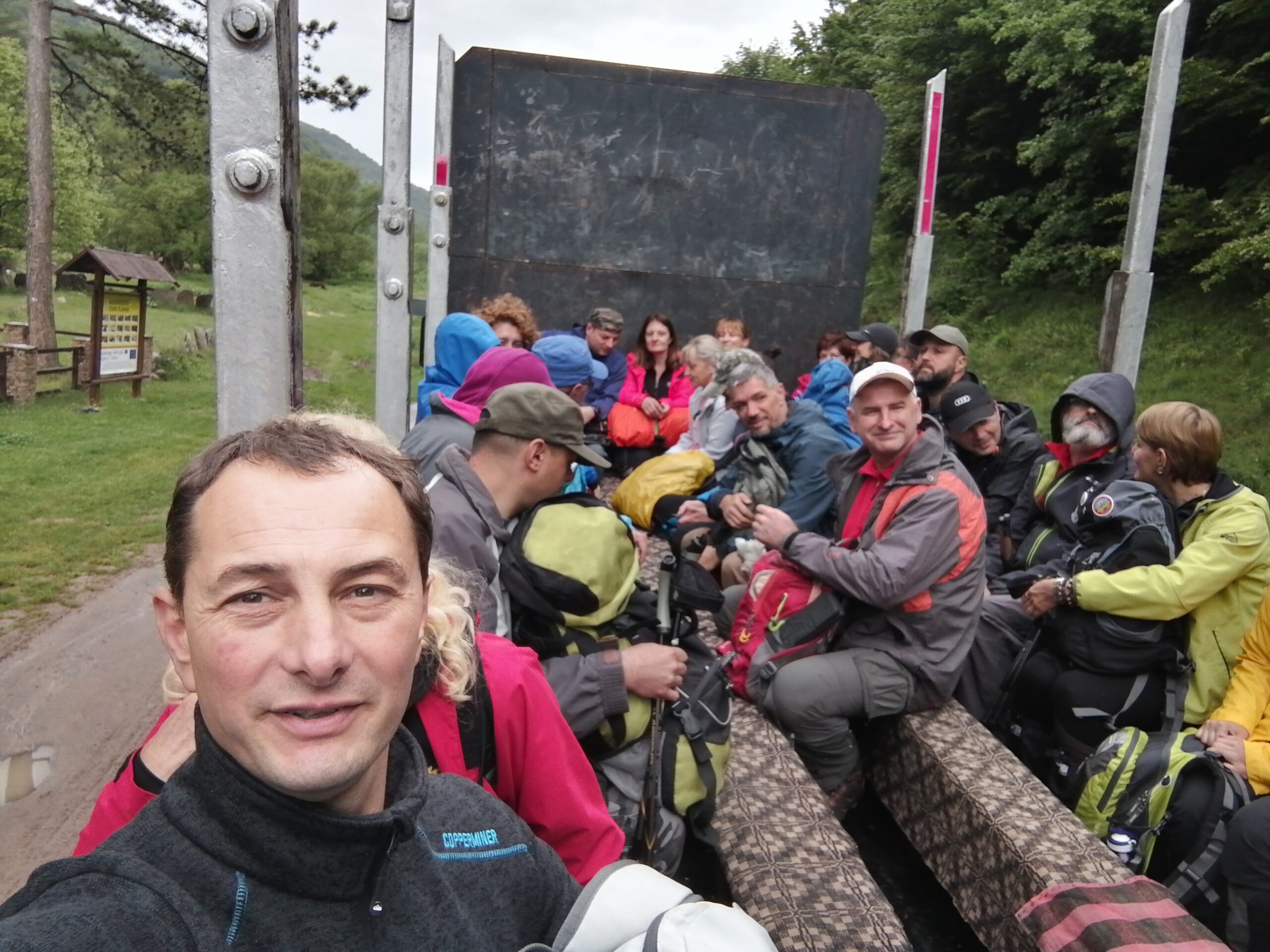 Zaista, dom je bio odlično izgrađen, da ne kažem luksuzan, a Wi-Fi, nisu obezbedili. I tako do 9h, kiša usporava, skoro staje… Čekali smo još pola sata, i oko 9,30 sa rancima na leđima, se grupa od oko 40 planinara „utovarila“ na kamion za prevoz drveta / stabala, sa svim onim arnjevima i četiri reda klupa, samo to videti, i dovoljno je…