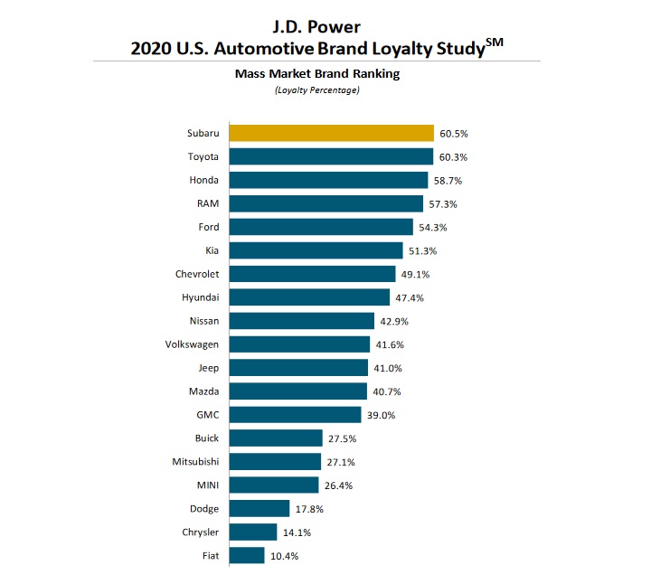 Subaru je poznat po izuzetno pouzdanim automobilima i nisu retke priče kako članovi familije naslede stari model Legacy ili Forester i nastave da ga koriste. U takvim uslovima šanse su velike da će i oni ponovo kupiti proizvod pomenute japanske marke, a prema statistici instituta, one su izražene kroz čak procenat lojalnosti od 60,5% ispitanih lica.