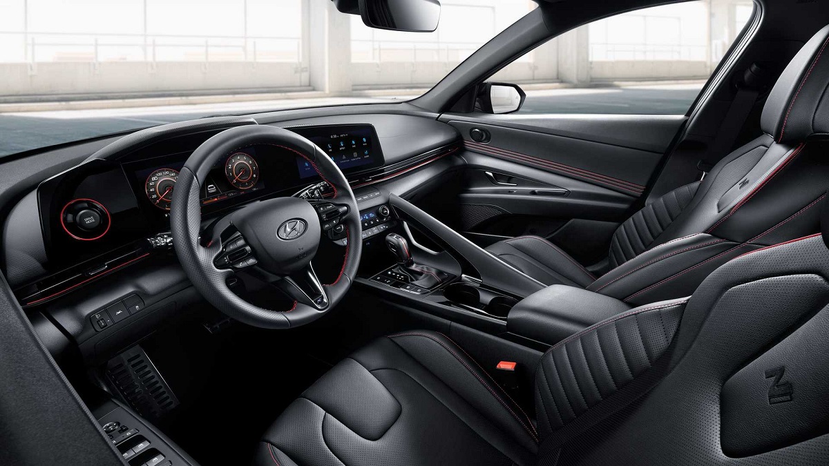 Pažljiviji pogled ka unutrašnjosti Elantre N Line otkriva prisustvo obruča upravljača s tri kraka, veliki taster za izbor režima vožnje (to je ono što nepismeni ili pak pokondirene tikve zovu „modovi“), sportska sedišta koja opciono mogu biti presvučena kožnom navlakom, crvene kontrastne šavove i dekorativne detalje izrađene od metala ili materijala koji asocira na isti.