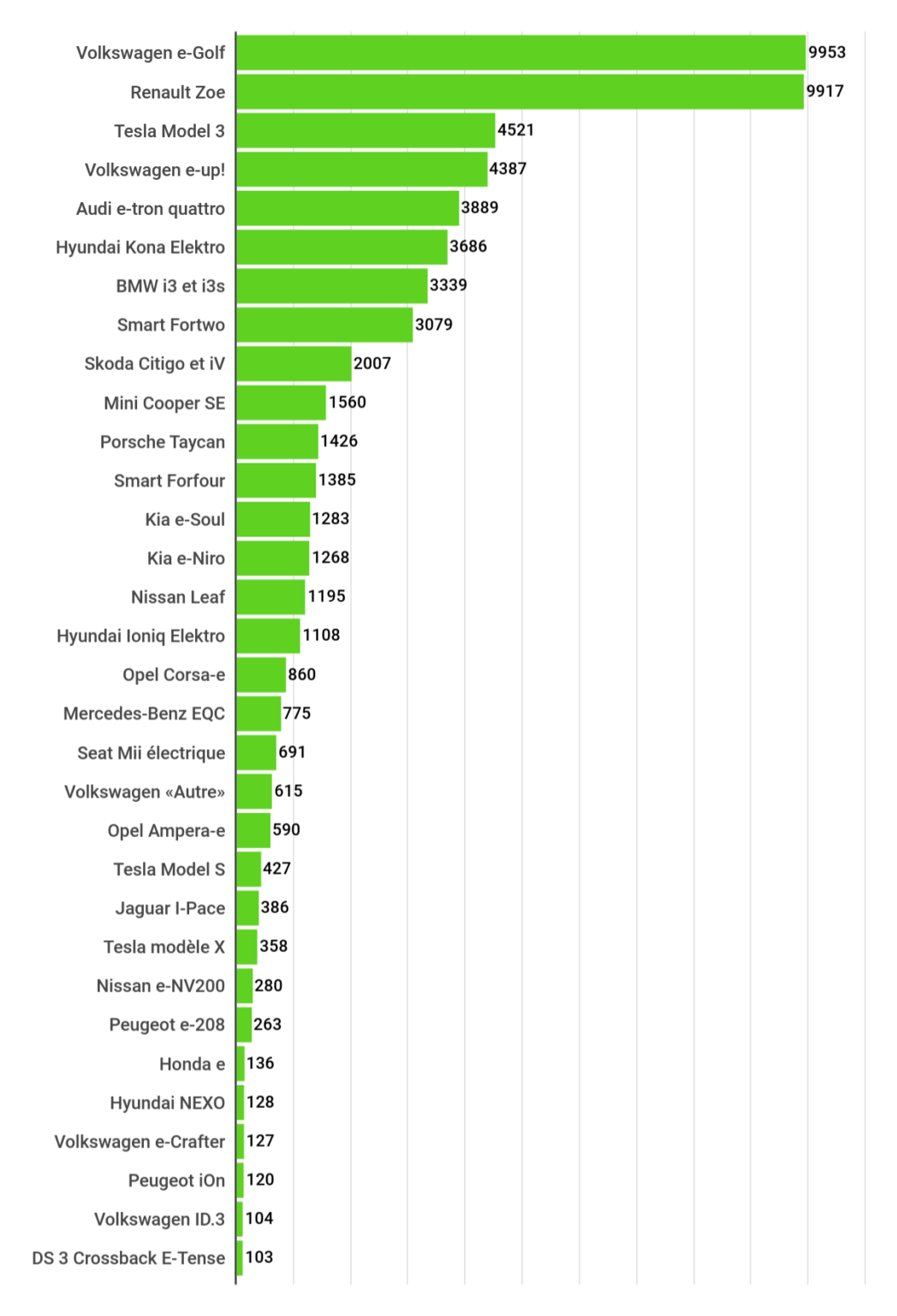 Od početka ove godine na nemačkom tržištu je registrovano 61.105 novih električnih automobila, što je skoro koliko i za celu 2019. godinu (63.281). Kada je reč o dosadašnjem delu godine, kod električnih modela na prvom mestu je e-Golf sa 9.953 prodata primerka, sledi ga Renaul Zoe (9.917), dok je na trećoj poziciji Tesla Model 3 (4.521).