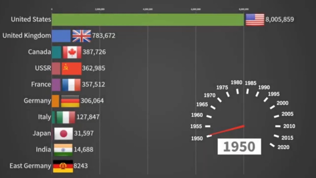 Do sredine pedesetih godina prošlog veka, nekada razrušena (zapadna) Nemačka izbija na drugo mesto, ali nagli rast Japana nekoliko godina kasnije šalje državu „izlazećeg Sunca“ na vicešampionsku poziciju. Dok su američki brojevi uglavnom ostali isti, proizvodnja u Japanu je eksplodirala, posebno tokom sedamdesetih godina, a sve zahvaljujući proverenom kvalitetu i jeftinom radnom snagom.