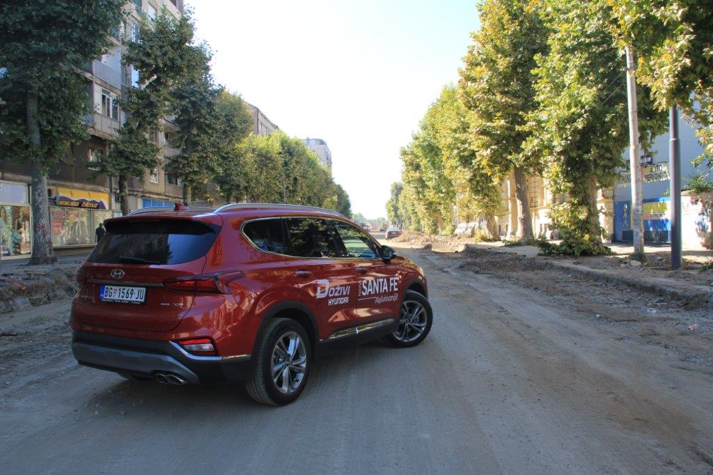 Što se tiče gradske vožnje, prvo s čim se morate pomiriti su gabariti ovog vozila, a sa njima ide i potrošnja. Sa svojih 4.770 mm dužine, 1.890 mm širine i visinom od 1.680 mm ovo nikako nije mali automobil. To ćete osetiti ponajviše prilikom traženja parking mesta, koje će Santa Fe zauzeti u potpunosti. Ipak, manevrisanje na parkingu je maksimalno olakšano zahvaljujući sistemu kamera od 360 stepeni i senzorima, koji u tandemu odlično pokrivaju okruženje vozila. Sistem kamera možete i sami aktivirati pritiskom na dugme na centralnoj konzoli prilikom provlačenja kroz tesne uličice kako biste bili sigurni da nećete ogrebati karoseriju oplemenjenu opcionom metalik farbom.