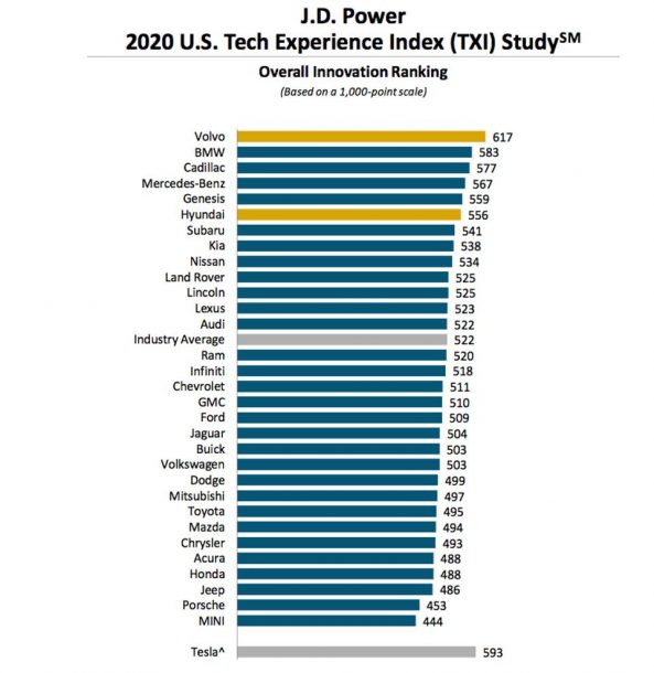 No, poenta ove studije bila je da se vidi koja to marka koristi najbolju tehnologiju, odnosno čiji sistemi zadaju najmanje glavobolje vozačima. Na skali do 1.000 mogućih poena, najbolje je bio plasiran Volvo sa 617 bodova, slede ga BMW sa 583 poena i Cadillac sa 577. Na prvih pet pozicija nalaze se premijum brendovi, dok je među velikoserijskim markama najbolje plasiran Hyundai sa 556 poena (ukupno 6. na listi).