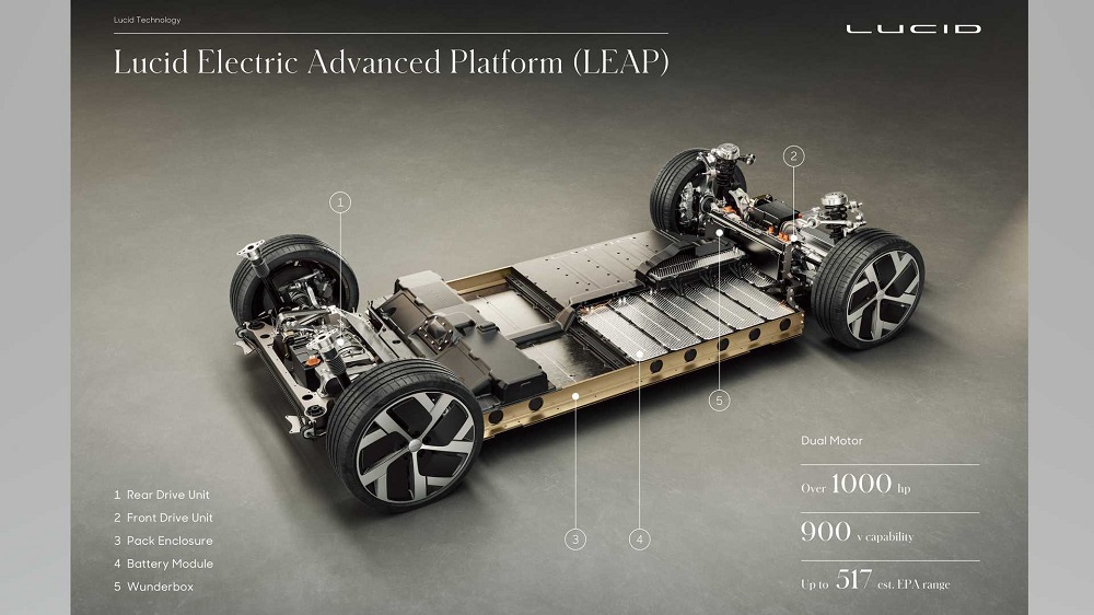 Proizvođač kaže da će njegov predstavnik doneti revolucionarne promene u industriju, i da će to postići sistemom brzog punjenja, pa će se baterije moći napuniti za vožnju od 480 km za samo 20 minuta. Spomenute baterije su zapremine 113 kWh i razvijene su u potpunosti od strane Lucida. Svi vlasnici dobijaju tri godine besplatnog punjenja. Proizvođač kaže da su njegovi agregati za 2,5 puta manji od onih u Tesli, čime je ukupna masa vozila niža.