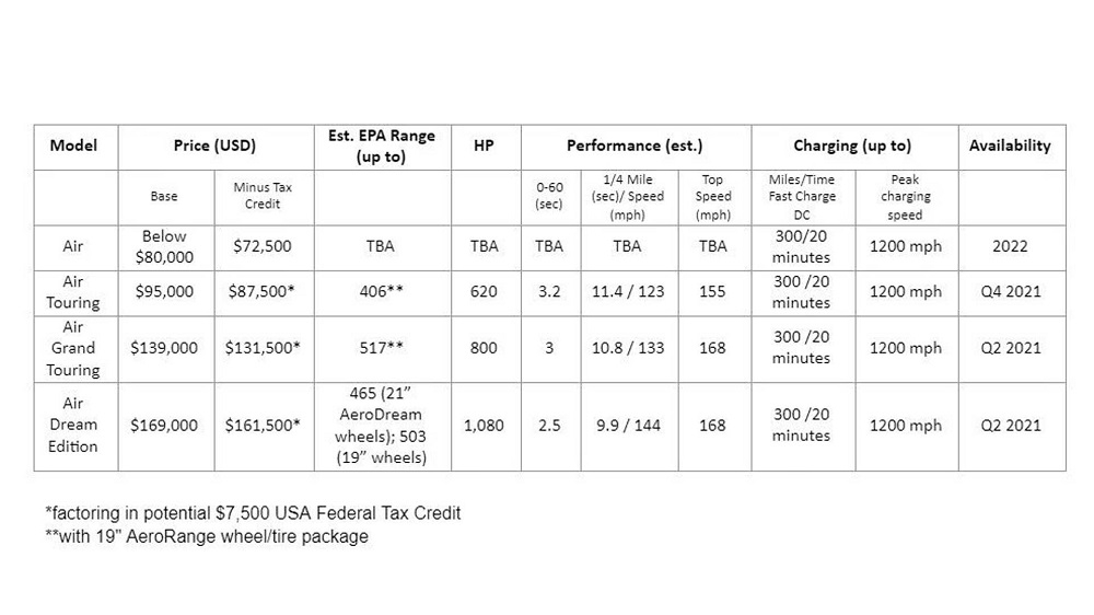 Krajem naredne godine stiže i Air Grand Touring sa cenom od „samo“ 95.000 dolara i autonomijom od 650 kilometara, a do 2022. godine ponuda će biti proširena i osnovnim modelom za koga Lucid planira da na mesto za cenu, stavi brojku od 80.000 američkih dolara. Pošto je Lucid novi proizvođač, na njegove modele će takođe važiti i državni popust od 7.500 dolara po prodatom vozilu.