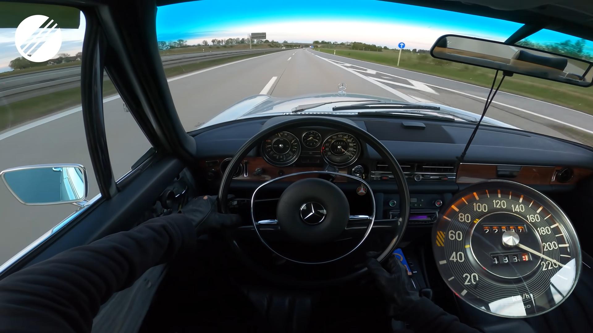 Mercedes-Benz 280 E Strich 8 W114 185 ks, na snimku „leti“ 220 km/h, a na toliko je i graviran brzinomer. Prosečna brzina je iznosila oko 200 km/h. Naravno, treba uzeti u obzir da je brzinomer podešen tako da „krade“, to jest da pokazuje par procenata višu brzinu no što ona zaista jeste. Fabrički podaci kažu da je maksimalna dostižna brzina kretanja ovog automobila (kada je nov) 200 km/h.