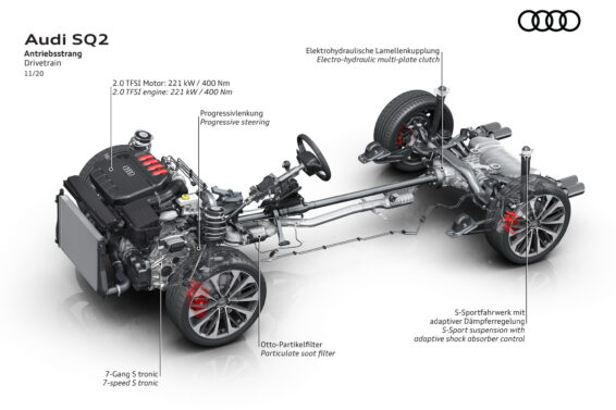 Za početak, Audi nije ništa menjao kada je reč o samom agregatu. SQ2 i dalje koristi dvolitarski TFSI motor koji raspolaže sa 300 ks i 400 Nm. Ova pogonska jedinica uparena je sa sedmostepenim automatskim menjačem i snaga se prenosi na sve točkove. Performanse su naravno odlične. Ubrzanje do 100 km/h se obavlja za 4,9 s, dok je maksimalna brzina elektronski ograničena na 250 km/h.