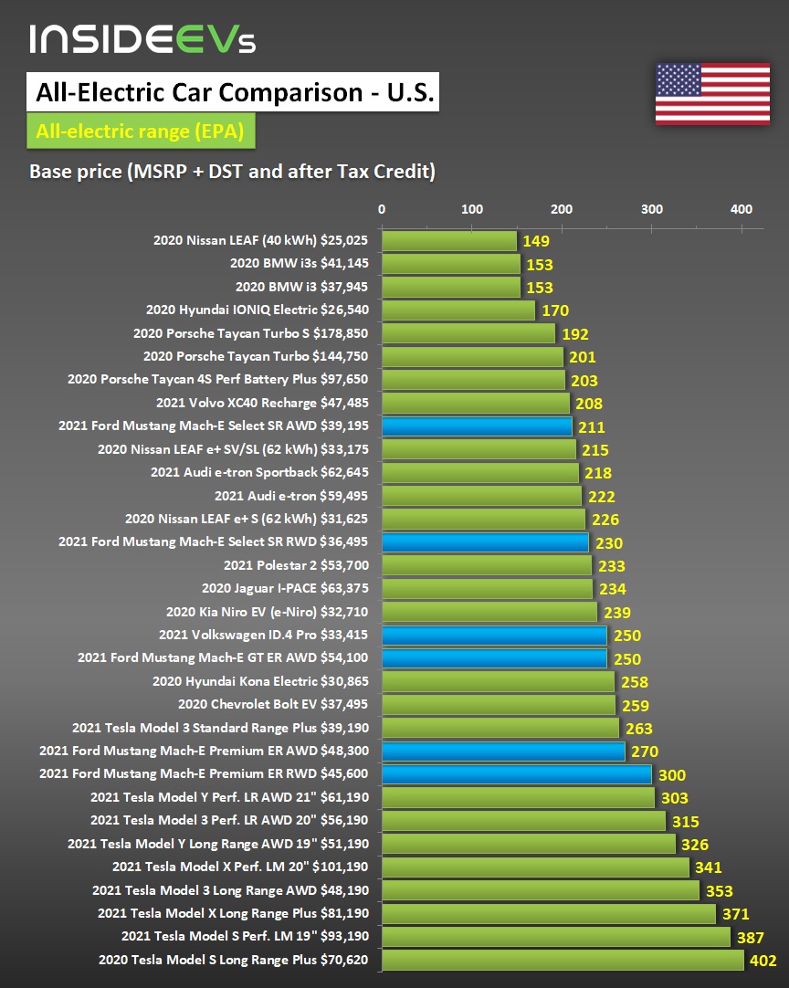 Najveću distancu sa jednim punjenjem baterija može da pređe paket sa imenom Premium ER sa pogonom na zadnje točkove, a reč je o brojci od 483 km. Takva cifra nadmašuje svakog električnog rivala u Americi sa izuzetkom onih koji napuštaju proizvodnu traku kompanije Tesla. Glavni konkurent Mach E je Tesla Model X, koji ruku na srce košta daleko više novca, ali se pri tom može pohvaliti i daleko većom autonomijom.