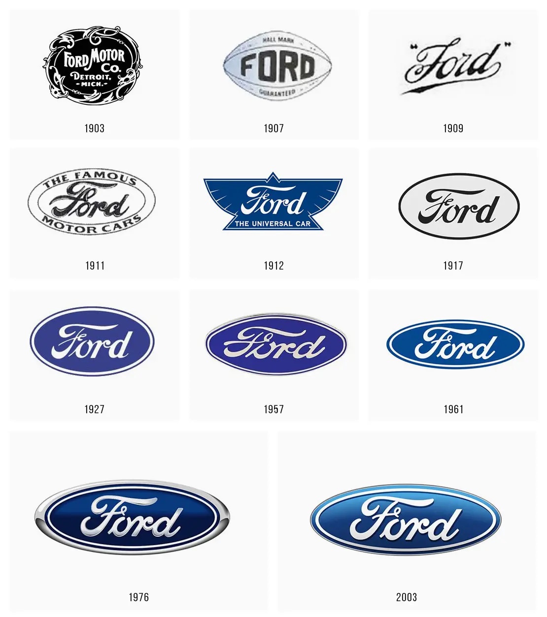 Znajući sve to, nije iznenađenje što je Fordov logo takođe izuzetno popularan i prepoznatljiv širom sveta. Iako se on menjao viša puta kroz istoriju, što možete da vidite iz priložene fotografije, generalna ideja je ostala ista – ime brenda pisanim slovima u sredini kruga gde je pozadina ofarbana u plavu boju.