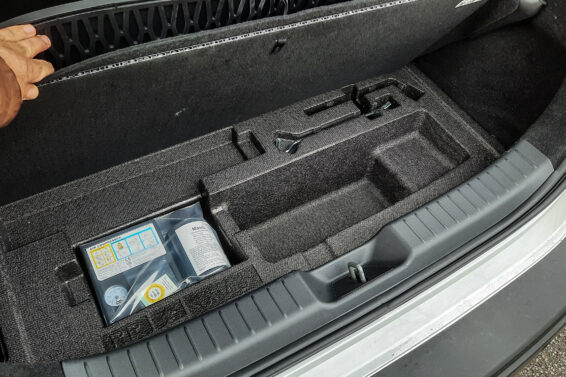 Maločas spomenuh i instrumente, treba precizirati da je samo centralni brzinomer, s putnim računarom u sredini, numerički. Za stanje baterije i nekakav ekonometar zaduženi su analogni (levo i desno od njega), sa klasičnim kazaljkama. Uz to, predviđen je i serijski „head up“ pokazivač, koji projektuje razne informacije na vetrobransko staklo. U našem slučaju enerijer je u braon/crnoj kombinaciji (ambijent nazvan „Industrial Vintage“), no imao sam priliku smestiti se i u elegantan belo/sivi („Modern Confidence“). Ostaje nam još prtljažnik, pravilnih formi i zapremine od 366 litara. Po obaranju zadnjih naslona dobije se potpuno ravna površina, zgodna za utovar kabastih predmeta, tipa veš mašina ili komoda.