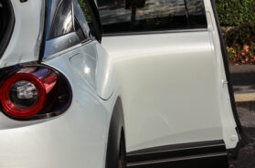 Pozabaviću se opširnije potrošnjom i autonomijom malo kasnije, nakon što vas upoznam s oblinama MX-30. Slike verovatno govore više od reči, recimo samo da je stil prilično originalan. Prednji deo samo iz daleko podseća na aktuelne modele proizvođača, zapravo inauguriše „lice“ koje će slediti nove generacije. Zadnji je u nekakvom kupe-krosover stilu, sa snažno zakošenim C stubom. Na izgled poseduje sve atribute jednog SUV-a, kao što su veliki prorezi za točkove sa masivnom plastičnom zaštitom i izraženim neofarbanim branicima. Ukoliko i ne deluju toliko elegantno kao kada su u boji karoserije, daleko su praktičniji u svakodnevnoj upotrebi. Ko je vozio po Parizu zna šta govorim, jednostavno zgadilo mi se da nakon par dana vožnje pronađem više ili manje duboke ožiljke na njima.