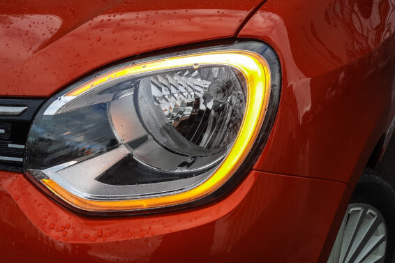 Podsećanja radi, sredinom prošle godine Twingo je lako osvežen, da bi se uvidele razlike treba ih staviti jedan pored drugo, bivši i sadašnji. Tek tako se možemo uveriti da nema više farova u prednjem braniku, i da je ovaj modifikovan. Pri dnu su uočljive „škrge“ koje po svemu sudeći služe za hlađenje kočnica, jer je motor, kao što znamo, i kod termičke i kod električne izvedbe smešten pozadi, u dnu prtljažnika. Izmenjena je i svetlosna grupa, dnevna svetla i pokazivači pravca (LED) sada okružuju glavna svetla, s i dalje klasičnim halogenim sijalicama.
