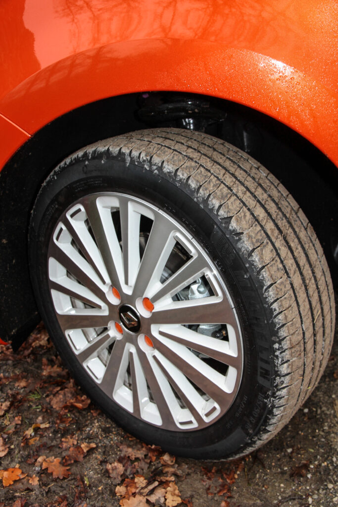 Iako je i ovde električni motor pozadi (znatno lakši u poređenju s termičkim), baterije u podu doprinose boljem rasporedu mase (+ 165 kg) i nižem težištu. U poređenju s benzinskom verzijom električna mi deluje manje živahna, u pozitivnom smislu te reči. Naime, zadnji kraj nema želju da se prošeta po klizavom putu, iako sam par puta u kružnim tokovima izvan grada insistirao na tome. Upravo zbog toga treba istaći kako Twingo nema iste gume na svim točkovima, na prednjim su dimenzija 185/50 R16, a na zadnjim 205/45 R16 (barem na voženom).