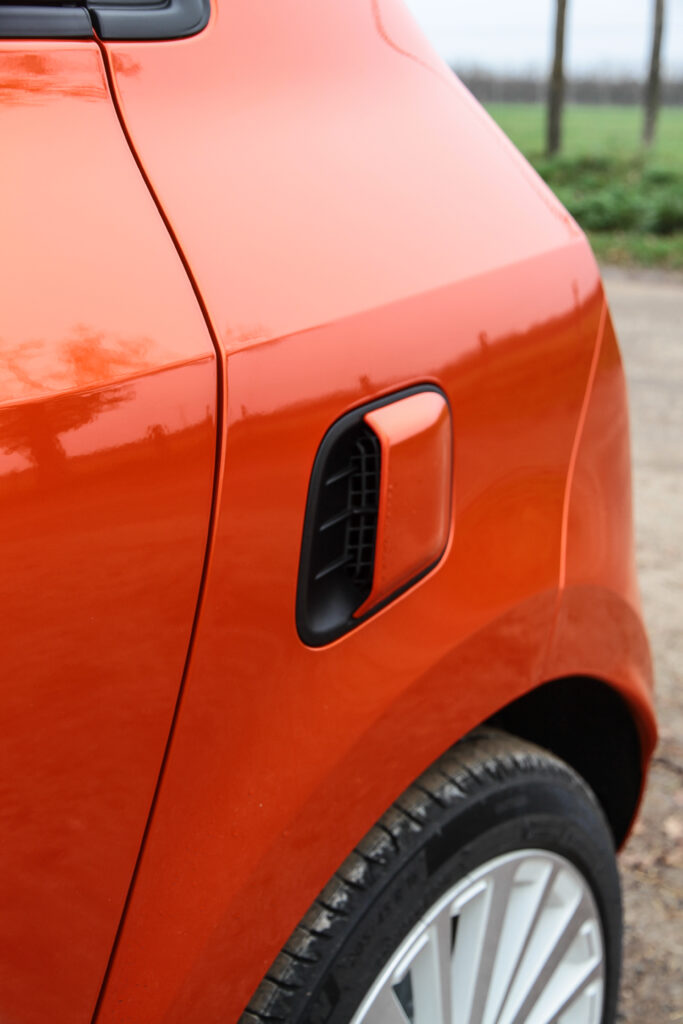 Profil je naravno neizmenjen, no pri zadnjem delu primetni su prorezi za hlađenje motora, kao kod „sportskog“ Twinga GT 0.9/110 KS (ukinut prošle godine paralelno s restilizacijom), koji se zadržani i kod električne izvedbe. S izuzetkom branika, ni na zadnjem delu nisam zapazio ništa novo. Na njemu nema više crne plastike gde je ranije bila smeštena registarska tablica, ali je dodato jedno praktično dugme, pri dnu brisača, sa kojim se otvaraju peta vrata, preciznije rečeno staklo. Dakle gotovo ista spoljašnjost ali u duši je posve druga priča.