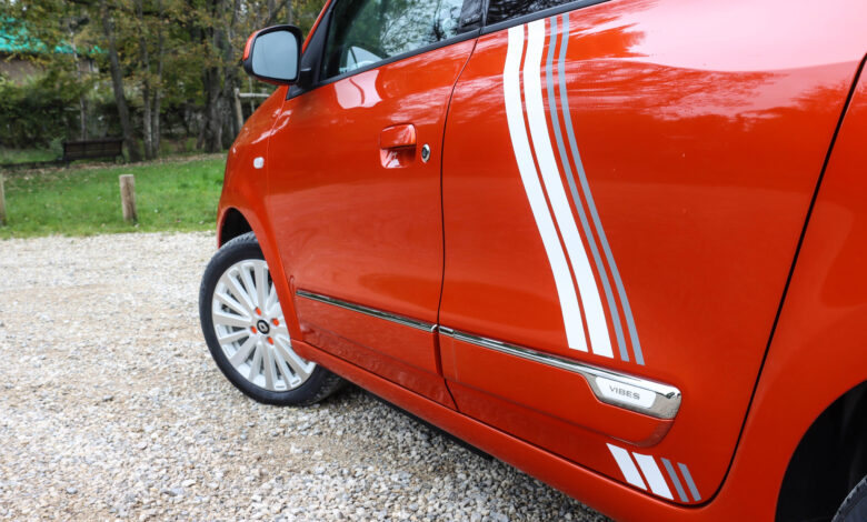 Spolja gledano, električni Twingo gotovo je identičan s ostalim verzijama. Jedino inflacija metalizirane plastike na prednjoj masci otkriva njegovo poreklo, dok se voženi Vibes, tzv. „serie special“ (specijalna serija), distancira jarko narandžastom bojom i nalepnicama, plus belim aluminijumskim naplacima. Simpatično, nema šta, nemali broj prolaznika i vozača znatiželjno se okrenulo za njim, potpuno neupućeni da se radi o električnoj izvedbi.