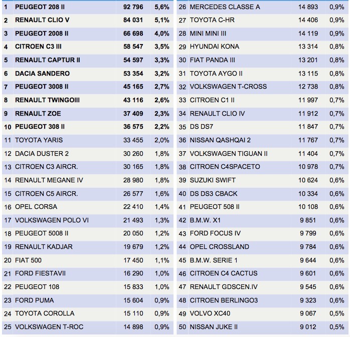 Lista top 50 najprodavanijih modela u Francuskoj: