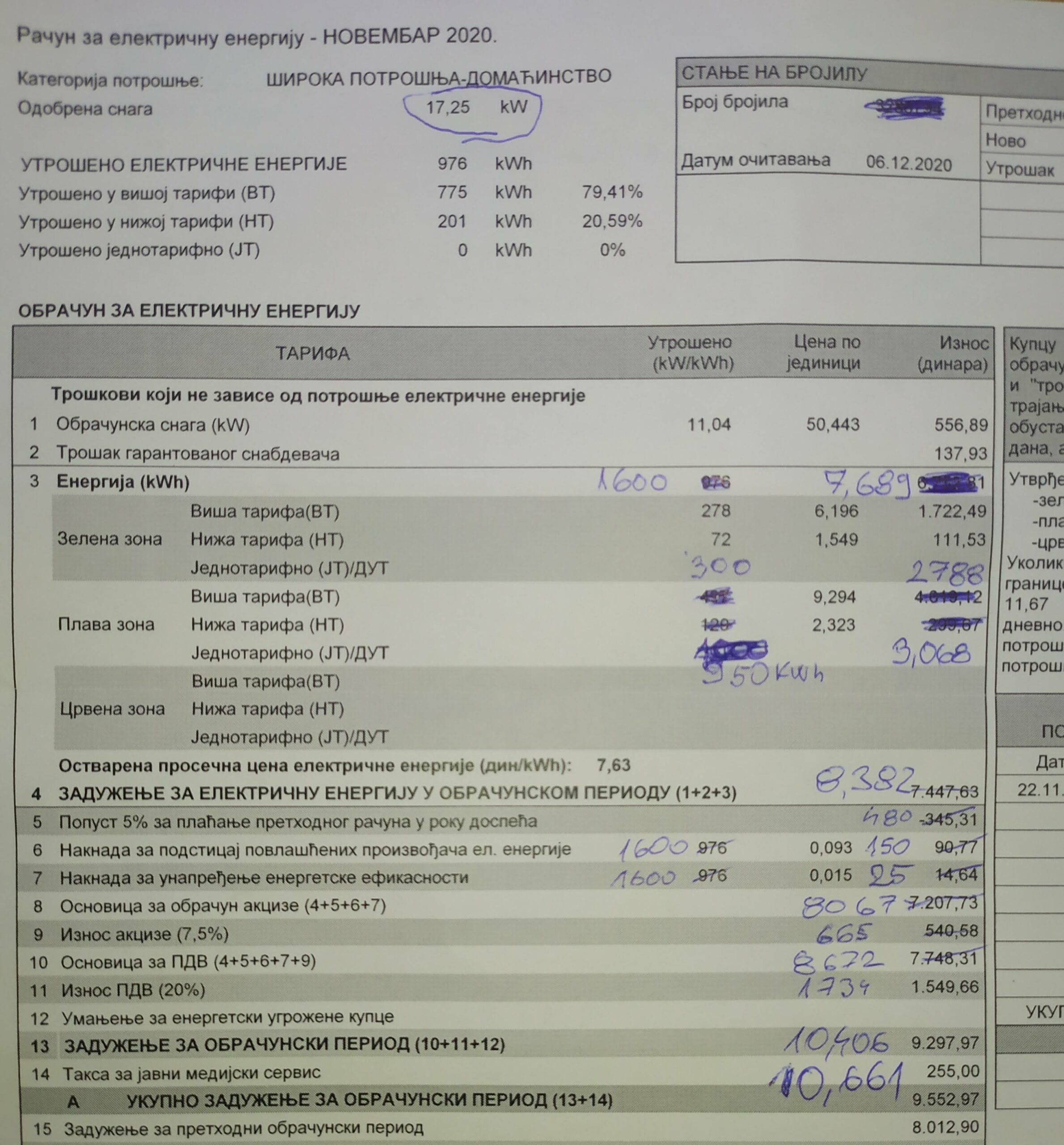 Naravno ovde se sukcesivno povećavaju akcize i porez na dodatu vrednost, i na kraju imamo ceh od 16 hiljada dinara za 1.600 kWh, što nam daje prosek cene od 10 dinara po kWh, koji onda možemo uporediti s javnim punjačima ili investicijom u trofazni priključak s većom odobrenom snagom, do recimo 17,25 kW.