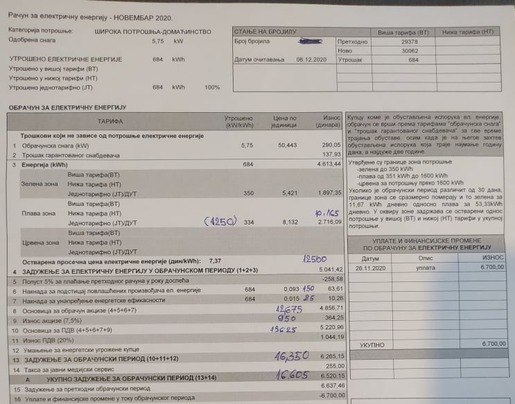 Cena struje u novembru 2020. godine je bila do utrošenih 350 kW po 5,4 dinara, a ostatak do 1.600 kW je koštao 8,13 dinara.