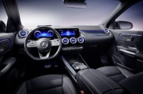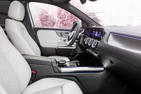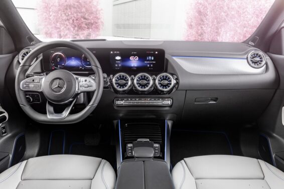 Putnička kabina novajlije je mnogo manje autentična u komparaciji s konvencionalnim GLA, pa i hečom s oznakom A KIase. EQA je najlakše prepoznati u moru višejajčanih štutgartskih blizanaca, gledajući samo kabinu po tome što poseduje interfejs na ekranima virtuelne instrumentacije MBUX multimedijalnog sistema, koji je prilagođen prirodi elektropokretanih automobila.