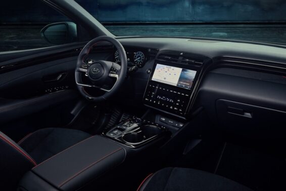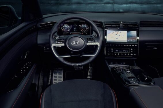 Vidimo lep crveni štep koji daje interesantan kontrast u kabini koja je „nemački“ siva. Osim toga, Hyundai je na nekoliko mesta postavio natpise N-Line, a uz to papučice su izrađene od aluminijuma, što sve izgleda atraktivnije nego li kod drugih izdanja Tucsona.