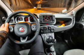 S međuosovinskim rastojanjem od samo 2,3 m zaista je okretna k’o čigra, s druge strane teško održava pravac prilikom snažnog kočenja pri višim brzinama. E da, u poređenju s mlađim konkurentima njena vozna dinamika je u velikom zaostatku. Neću ići tako daleko i reći kako je Panda nesigurna, već samo da je mudrije biti „cool“ za njenim upravljačem… ABS i ESP su naravno u serijskoj opremi, ne i regulator i limiter brzine.