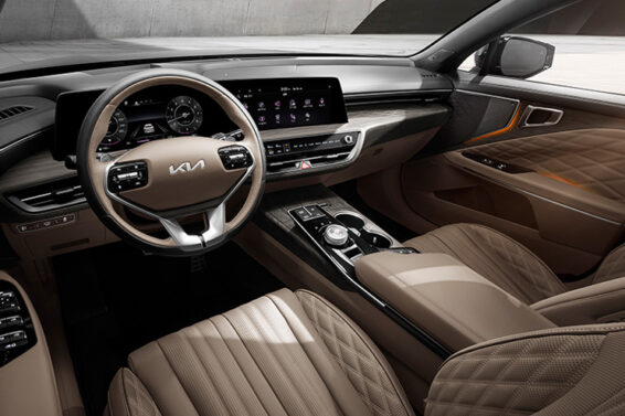 Ovih dana su objavljene i prve zvanične fotografije enterijera. Kia K8 poseduje jedinstven centralni greben u kom je smešten instrumentacioni panel i ekran multimedijalnog sistema. Svaka od dve potceline koristi po jedan ekran koji po dijagonali dobacuje po 12,3 inča.