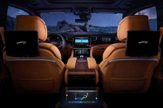 Ko se dodatno otvori pri kupovini Granda Wagoneera, dobiće još pet dodatnih monitora! Na dnu centarlne konzole je jedan s 10,3 inča (vidi dole desno) i on služi za uređaj za klimatizaciju i za sistem za zagrevanje kabine. Dalje, tu je ekran za kopilota iste dijagonale i on služi za muziku i ostale zabavne sadržaje. Dva su displeja multimedije dostupna putnicima u drugom redu (dole levo slikano), a ugrađen je i još jedan bonus ekran za one „mučenike“ s najudaljeninijim sedištima od šofera. Oni će moći tu da podešavaju postavke klima uređaja.