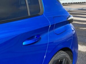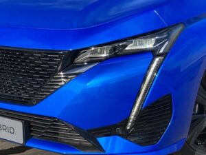 Prednja svetlosna grupa je vrlo tanka i izvedena je u Matrix LED tehnologiji. Naravno, dnevna svetla i pokazivači pravca integrisani su u „očnjake“ koji se pružaju uz glavnu svetlosnu grupu i predstavljaju jednu od odlika modernog dizajna Peugeota. Pogled s boka ukazuje na to da su proporcije nove generacije galskog hečbeka drugačije od nekadašnjeg modela sa značajno dužom haubom, što mu pruža poseban šmek. Osim toga, francuska marka je i na prednje krilo postavila novi logo.