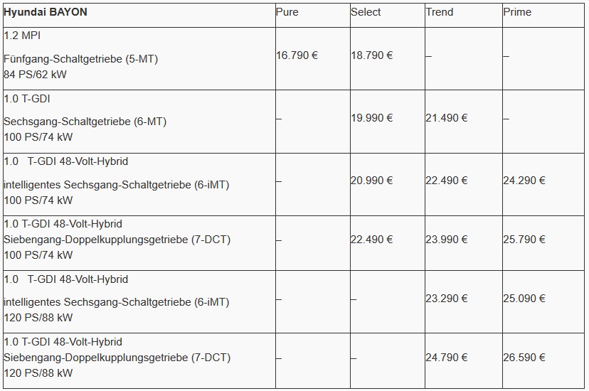 Bayon je tako najjeftiniji SUV Hyundaija, jer mu početna cena za bazno izdanje u Nemačkoj iznosi 16.790 evra. Hyundai će ponuditi trimove Pure, Select, Trend i Prime. Uvodna varijanta je Pure i nudi manuelni klima uređaj, potom napredne sisteme bezbednosti poput AEB, te detekciju pešaka i biciklista, a tu su i digitalni radio kao i bluetooth konekcija. U baznom izdanju Bayon koristi 1,2-litarski atmosferski četvorocilindarski benzinski motor koji isporučuje 84 ks.