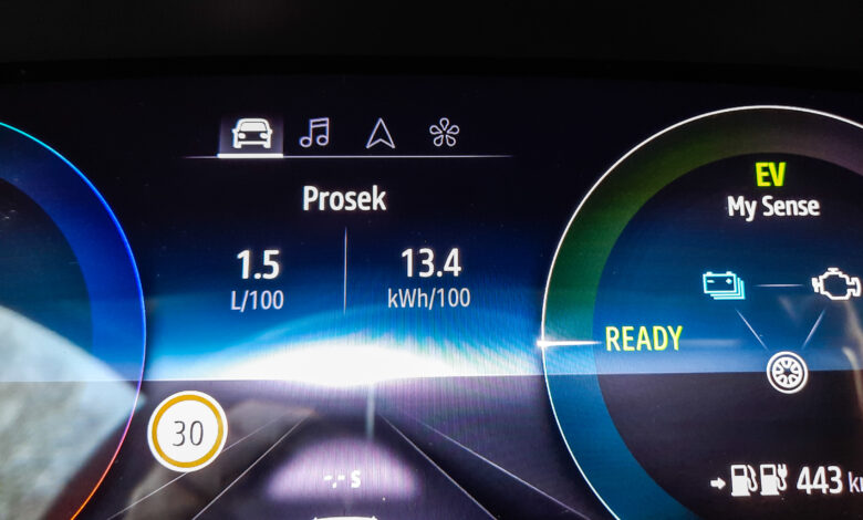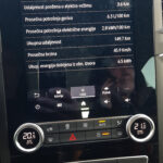 Jednim pogledom na isti možemo se uveriti da se baterija dopunjuje (duga plava boja u donjem delu pokazivača), odnosno koja vrsta pogona je angažovana. Siva u gornjem podeoku označava rad benzinca, a zelena električni mod (pogledajte slike). U 100 % električnom modu potrošnja se kreće između 14 i 22 kWh, pre nego li su baterije ispustile dušu putni računar je pokazao prosek od 17,5 kWh.
