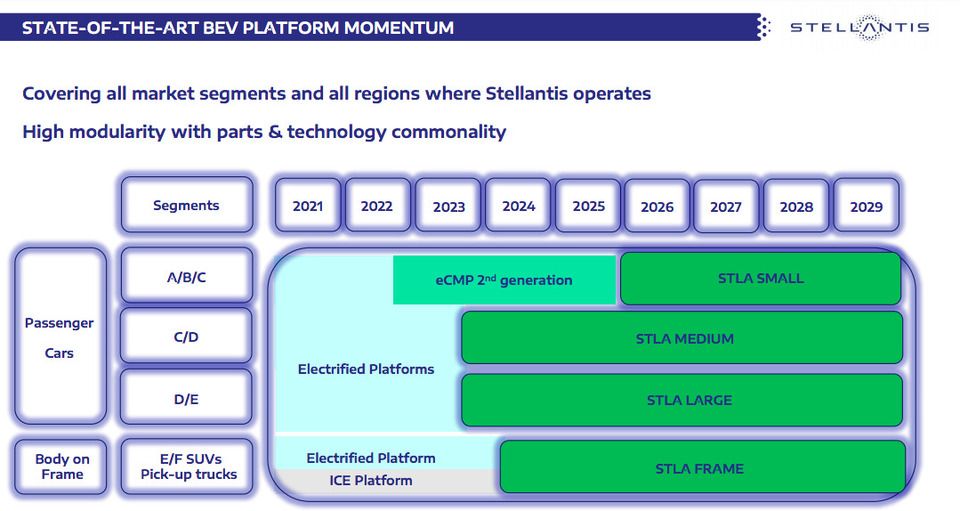 Nakon toga, 2024. godine Stellantis će predstaviti STLA Frame namenjenu velikim SUV modelima i pikap kamionetima. Poslednja će stići STLA Small koja će biti baza za buduća vozila iz A i B segmenta. Potonja arhitektura naći će se u ponudi tek 2026. godine.