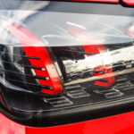 Navedimo još masivnu i blago ispupčenu prednju masku, dok zadnji deo karakteriše elegantna svetlosna grupa iz tri dela, integrisana u pojas od crne plastike (slično kao kod 508) i poveći spojler pri vrhu petih vrata. Za razliku od ranije voženog GT-Line ne pronađoh dupli završetak izduvne grane i niskoprofilne pneumatike od 17 cola, niti su prorezi za točkove uokvireni crnom lakiranom plastikom.