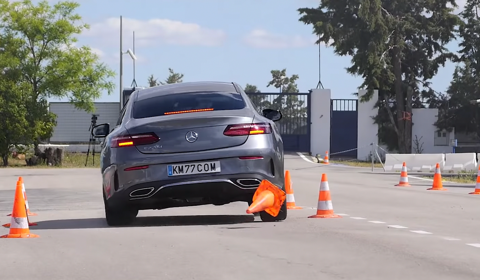 Španski test centar km77 testirao je na svom poligonu aktuelnu restilizovanu E klasu 220d u verziji kupea. Prvi pokušaj izbegavanja sjevernog jelena je ujedno bio i najuspešniji. On se odigrao pri umerenoj brzini kretanja vozila od 75 km/h. Vozač je naglasio da je automobil izuzetno izbalansiran i da ima lako predvidivo kretanje, a mogli smo čuti i da je sistem klasičnog oslanjanja u ovom Mercedesu na visini zadatka.
