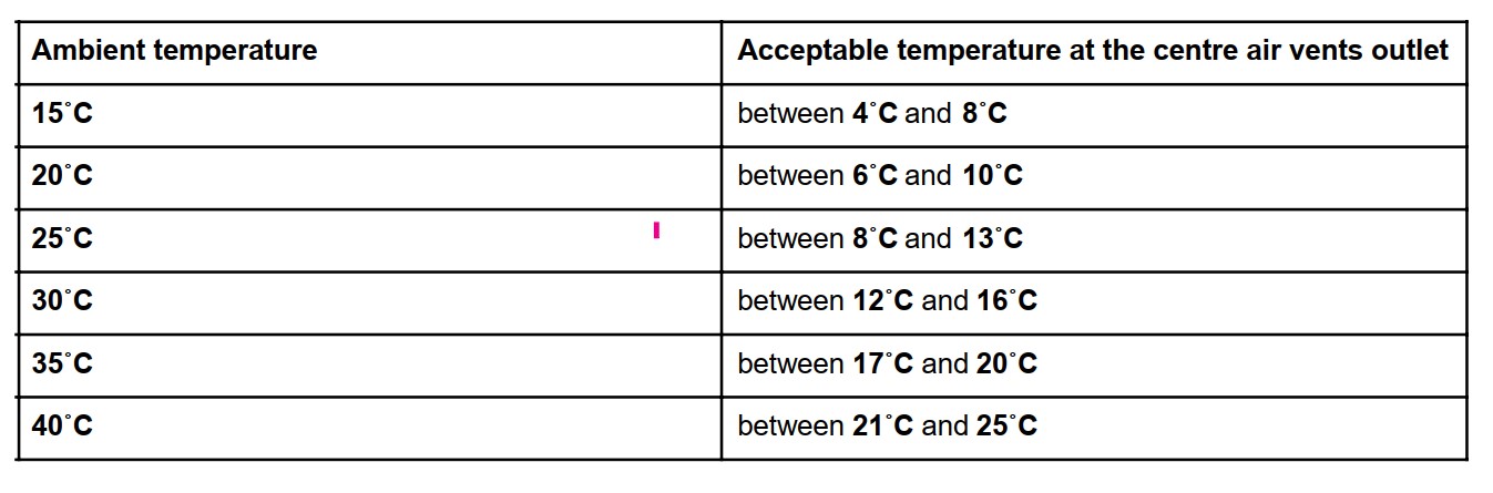 U tabeli su date prihvatljive temperature, koje se očitavaju, u odnosu na temperature spoljašnjeg vazduha i to posle 5 do 10 minuta rada klima uređaja.