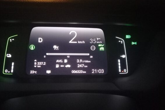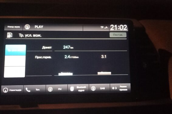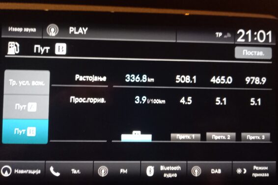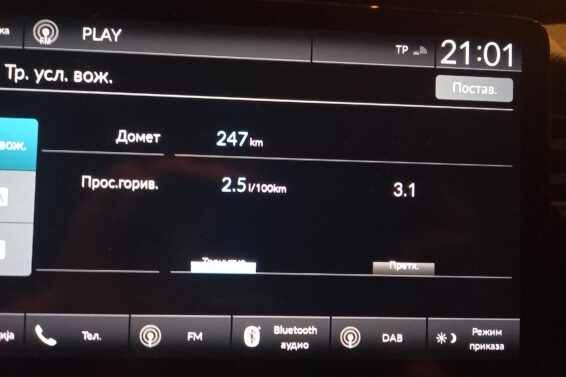 Utisak je da po gradu troši veoma, veoma malo (znao sam imati pojedinačne vožnje uveče, van špica sa samo 2,5 ili 3 litra, a poslednji dan testa u jutarnjem špicu sam ostvario 3,2 na distanci od oko 12 km ). Tako malo (uvek ispod 3) je trošio i dok sam se vozio Grebenskim putem, deo puta sa naizmeničnim usponima/nizbrdicama od po 11-12%, jer u tim uslovima se baterija nizbrdo brzo dopunjava inercijom, čime štedi gorivo na usponima. Po auto-putu troši malo više i mislim da kod testiranog Crosstar-a pri 130 km/h potrošnja ne prelazi 6,5, uz napomenu da po WLTP deklaracijama u veoma zahtevnom „najvišem režimu“ Crosstar ima deklarisanu potrošnju 6,2 (zbog većih dimenzija, klirensa i većih točkova ), a obične verzije 5,8 u prva dva paketa, te 5,9 u trećem nivou.