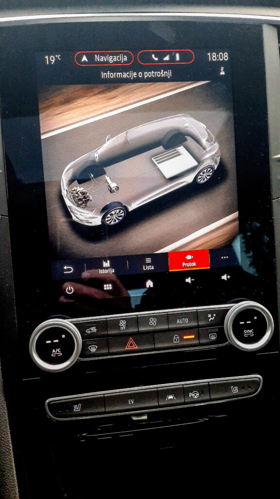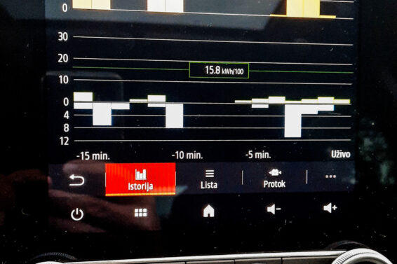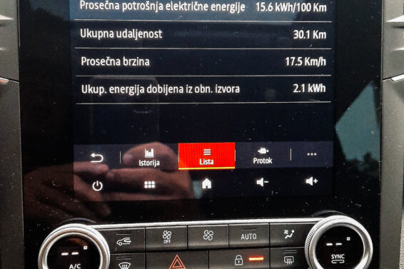 Odmah po davanju kontakta na putnom računaru očitah električnu autonomiju od samo 34 km, ostalu od prethodnih test vožnji. Relativna stvar, jer ovaj uzima u obzir nekakav prosek, ne uzbuđujem se, zato i ne donosim prerane zaključke. Osim startovanja instrumentalne table i poruke Ready, ništa se ne dešava, ovaj Megane startuje na struju, a baterije smeštene ispod zadnje klupe (poreklom iz LG), su kapaciteta 10,4 kWh. Nešto bolje nego li kod prošle godine lansiranog Megana karavan, koji je zvanično imao 9,8 kWh.