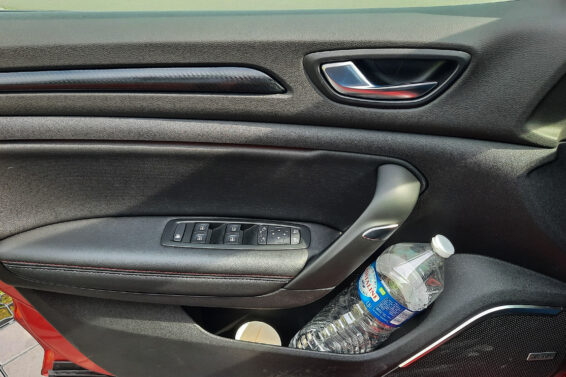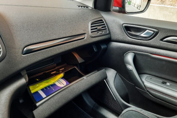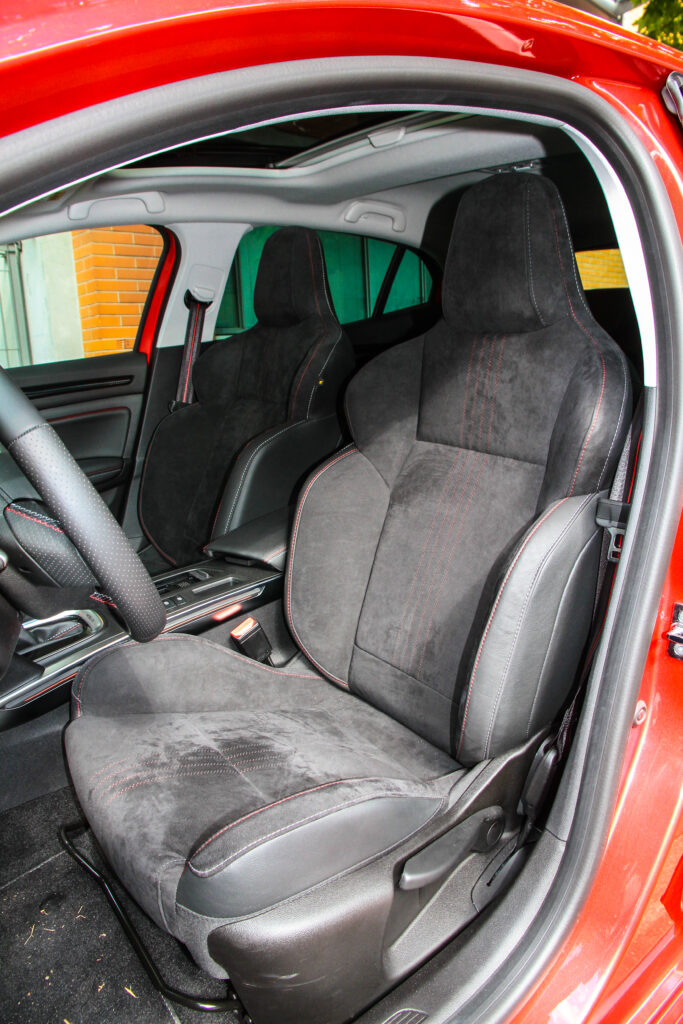Enterijer odiše sportskim duhom, što je zasluga navedenih sedišta, sportskog upravljača, nožnih papučica od aluminijuma i štepova od crvenog konca. Praktični aspekt nije zapostavljen, oslonac za desni lakat je ujedno i poveći boks, dok u vrata staju „test“ flaše od 1,5 l. Za razliku od karavana kod hečbeka je vidljivost unazad znatno lošija, sva sreća te su predviđeni svi mogući senzori i kamera za pomoć pri parkiranju.