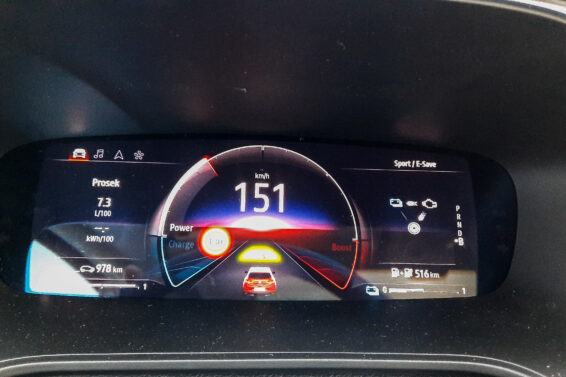 Ostaje nam još čisto električna vožnja, uz malo dobre volje s ovim Meganom uspeo sam preći oko 40 km, dakle desetak kilometara manje nego što Renault obećava. Kao i kod svih hibrida i električnih automobila sistem za rekuperiranje energije funkcioniše prilikom kočenja i po podizanju stopala s papučice gasa (režim „brake“ pojačava usporenje a angažuje se naknadnim povlačenjem ručice ka sebi), što se isto tako može videti na numeričkom pokazivaču, s desne strane instrument table. Jednim pogledom na isti možemo se uveriti da se baterija dopunjuje (duga plave boje u donjem delu pokazivača), odnosno koja vrsta pogona je angažovana.