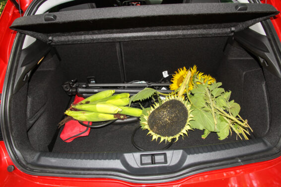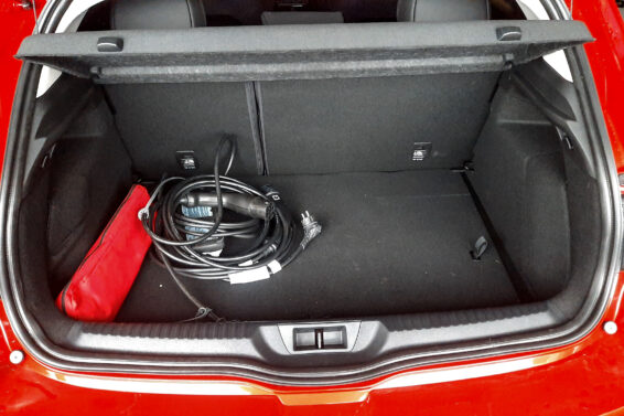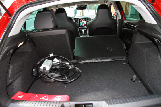 Kod karavana međuosovinsko rastojanje je produženo za 5 cm, što uz drugačiju formu C stuba koliko toliko pomaže. Kod ovog je i zapremina prtljažnika veća (450 l), no i on je zbog baterija izgubio 130 l. Kod našeg hečbeka smanjen je na nivo vozila iz B segmenta, konkretno umesto 473 l spao je na 308 l! Ne, nemojte ga odmah staviti na stub srama, ni izvesni VW Golf e-Hybrid nije ništa bolji, njegov prtljažnik ima svega 272 l. Vidljivo je dakle plići i nema šanse da se ubaci rezervni točak, kao ni da se sakriju kablovi za punjenje (dva komada). Naravno da se obaranjem zadnjih naslona može povećati, kada se dobija potpuno ravan pod.