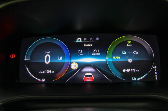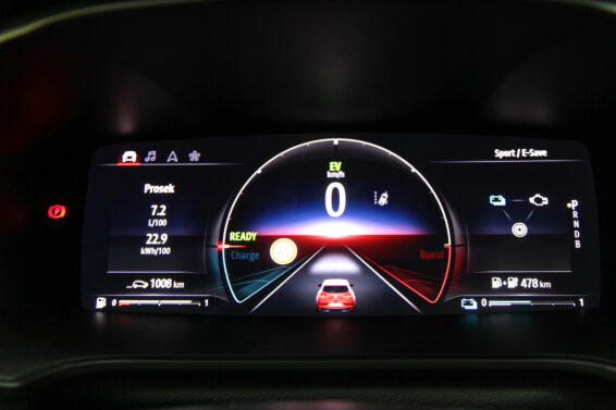 Porasla je i instrument tabla na 10,2 inča (25,9 cm), uz izmenjenu grafiku. Svega tu ima, raznoraznih boja i oblika za svačiju dušu. Kod našeg hibrida je naravno drugačija, adaptirana je ovakvom pogonu. Za žaljenje je odsustvo obrtomera, kada su baterije prazne zanimljivo bi bilo videti u kom je režimu rada agregat. Jer ponekad, u „leru“, obrtaji naglo porastu, procenjujem i do 3.000 o/min. Neophodna kolateralna šteta kako bi se na brzinu „dopingovala“ baterija…