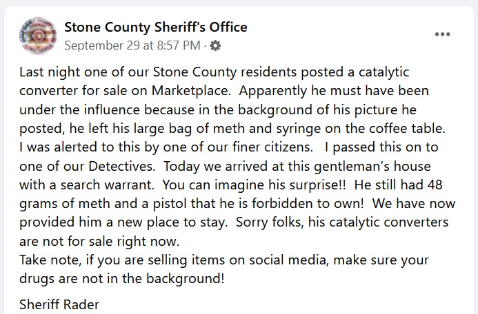 Ovu vest je policijska uprava malog gradića podelila na svom nalogu koji neguju preko društvenih mreža i napominju da je kriminalac iza rešetaka, a da katalizator više nije na prodaju.