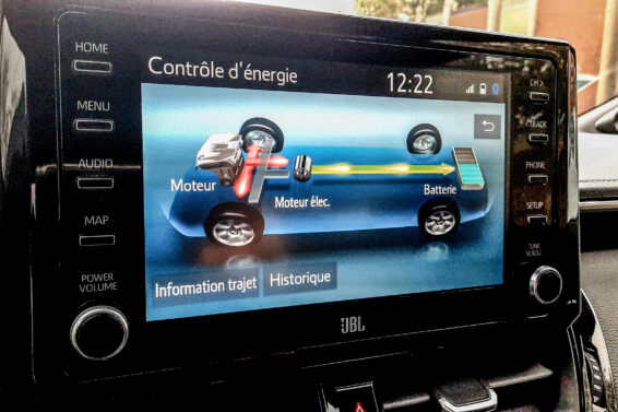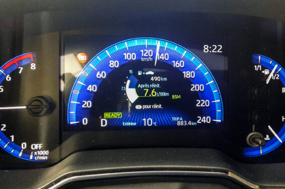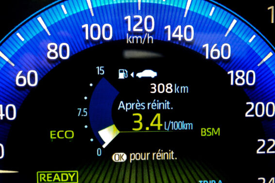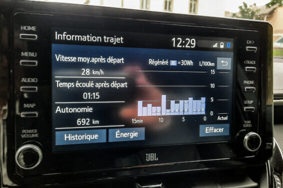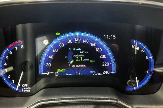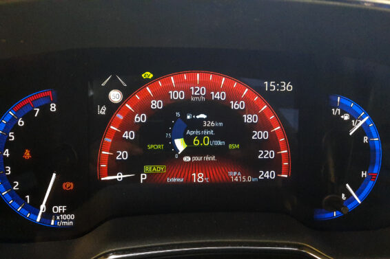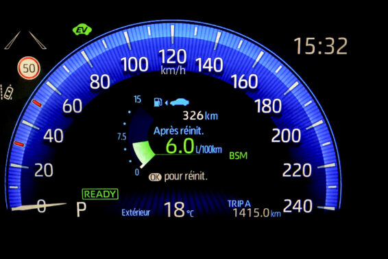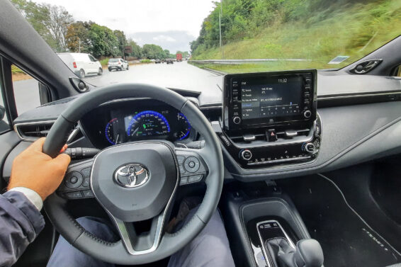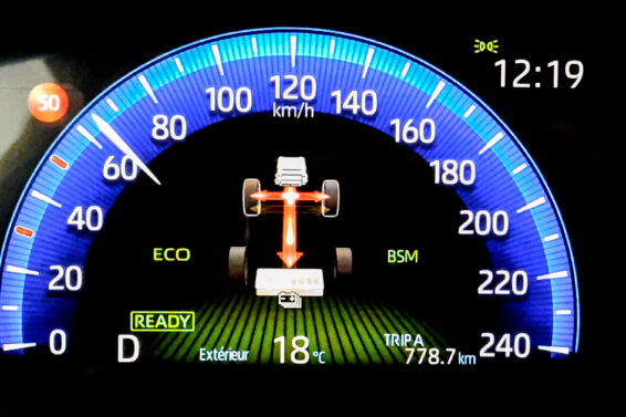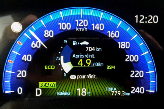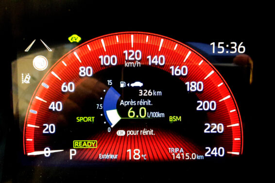 Da, da i to je predviđeno zakonom u Francuskoj, jednu takvu dobio sam pre par godina, jer sam, pazite sad, u vožnji jeo sendvič! Sve u svemu prosečna potrošnja nakon nekih 1.000 km stabilizovala se na tačno 6 l, hvale vredan podatak ukoliko se u obzir uzmu uslovi eksploatacije i performanse vozila. Kod ove Corolle ne stekoh utisak da menjač „melje u prazno“, osećaj koji često imamo kod CVT menjača. Buka koju oslobađa agregat proporcionalna je dakle ubzanjima, u Toyoti kažu da je ovde drugačije odmeren nego li kod slabijeg hibrida 1.8. Predviđene su čak i dve ručice za menjanje „brzina“ pored upravljača, povlačenjem leve poraste broj obrtaja SUS motora, odnosno smanji se kada se posegne za desnom.