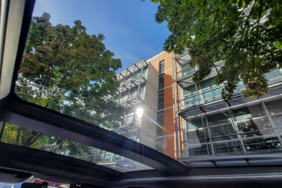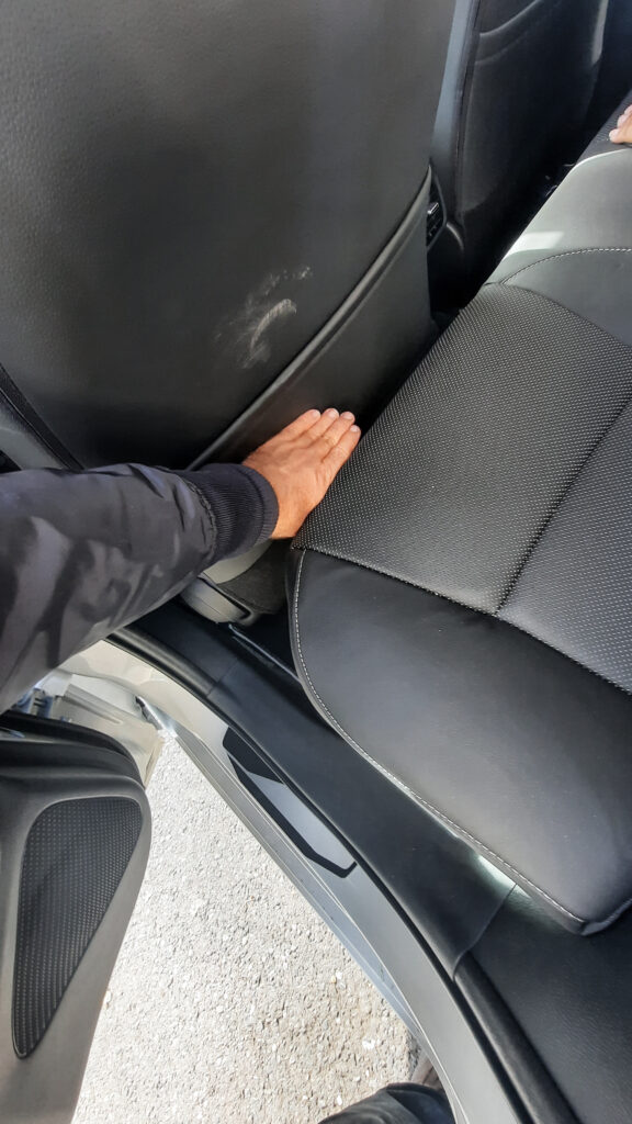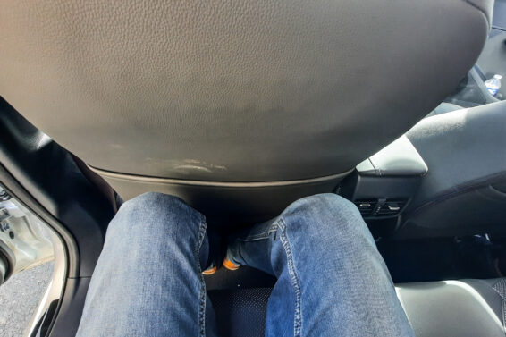 Iza vozačevog sedišta, podešenog za spomenutog deliju, ostalo je 4 prsta moje šake, što će reći samo 7-8 cm! Podešeno za moje dimenzije (1,72 m) dozvoljava smeštaj odrasle osobe sličnih dimenzija, viši od toga glavom dodiruju plafon, spušten zbog panoramik krova (-22 mm). Drugo, usled baterija smeštenih ispod klupe, sunđer na sedalnom delu je tanak, tako da je ova prilično tvrda i neudobna za duža putovanja. Potvrdiše mi to radnici (zidari) od mog drugara Milana, koje sam zbog nekog posla dva dana vozio na 150 km izvan Pariza. Bogami sve su se otimali i svađali ko će se smestiti na suvozačevo sedište…