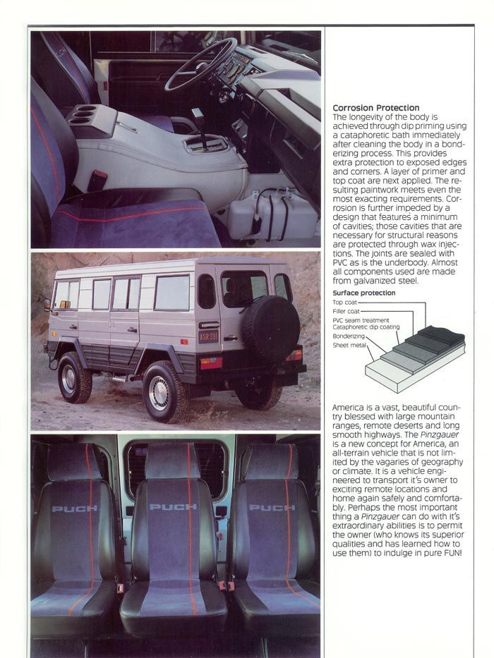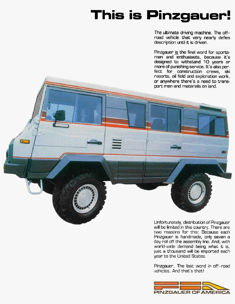 Pinzgauer se nikada nije prodavao na američkom tržištu i njegova civilna verzija direktno iz fabrike je bila veoma retka. Kompanija ih je proizvodila samo po specijalnoj narudžbi, ali malo je falilo da ulični model završi „preko bare“ u velikim brojevima. Ovo je priča o civilnom Pinzgauer koji su Austrijanci planirali prodavati Jenkijima.