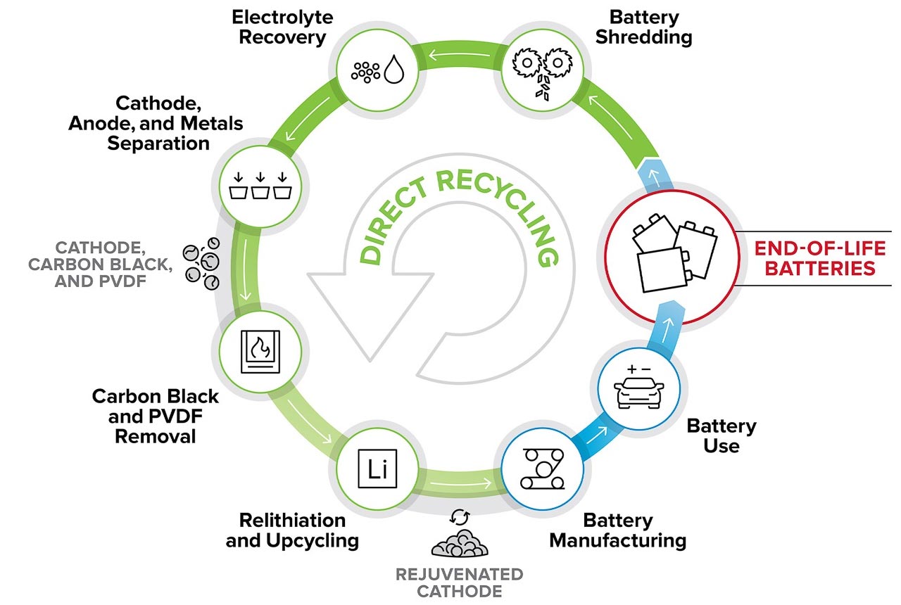 Dok se kobalt i nikl često recikliraju u visokim stopama, u većini slučajeva, litijum nije dovoljno vredan da bi ljudi uopšte i pokušali da ga recikliraju. Ako se litijum i povrati iz starih baterija, on često nije u kvalitetu pogodnom za pravljenje novih baterija. U budućnosti bi mogla postojati čistija i efikasnija opcija: direktno recikliranje ili odvajanje katodnog materijala iz pojedinačnih ćelija baterije i rehabilitacija smeša hemikalija unutar njega, uključujući dodavanje litijuma koji je dobijen iz upotrebljenih baterija, umesto ekstrakcije pojedinačnih metala iz mešavine.
