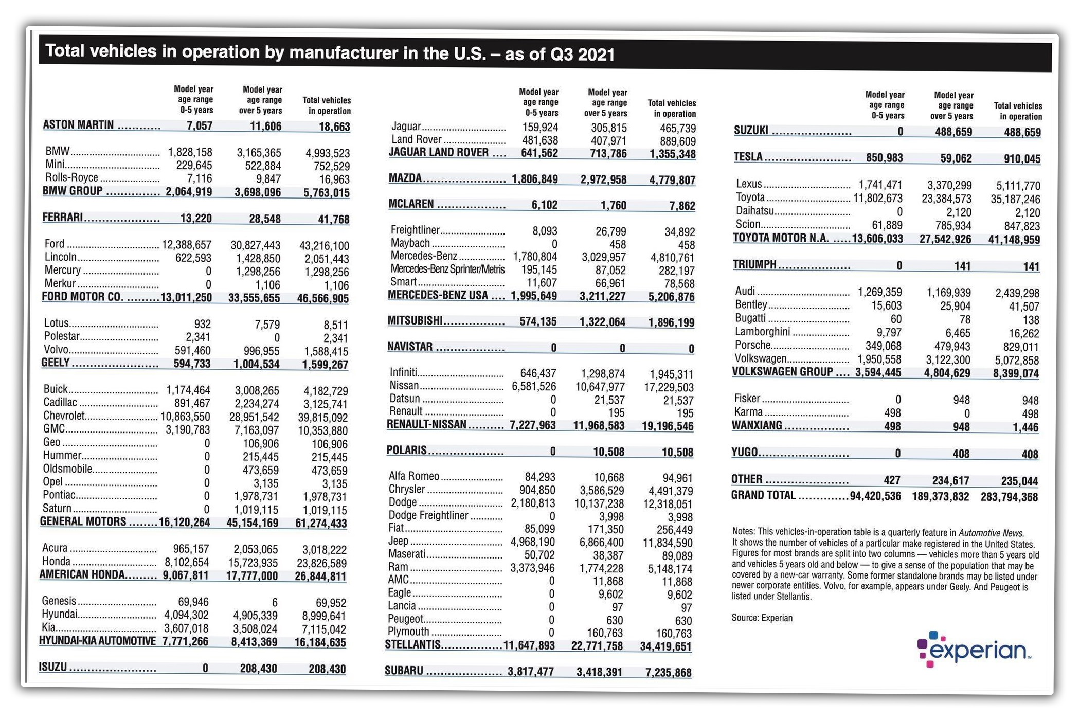 Ona je podeljena u dve kategorije, i to one koje obuhvataju vozila mlađa od pet godina, a zatim i ona starija od toga. I baš prema očekivanjima, dominiraju oni brendovi koji se najviše i prodaju. Na prvom mestu je Ford sa 43.216.100 vozila, prati ga Chevrolet sa 39.815.092 automobila, a bronzana medalja je pripala Toyoti sa 35.187.246 četvorotočkaša.