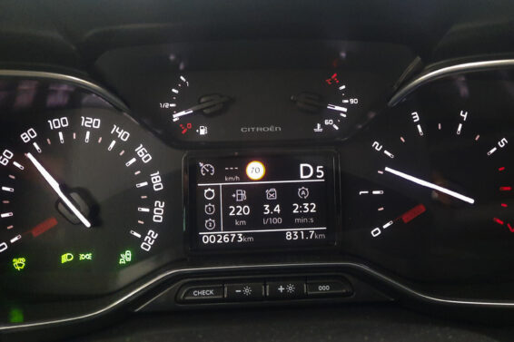 Sada ima mesta za odlaganje limenki ili čaša s kafom, dok je ručna kočnica praktičnija za manipulisanje. Uopšteno uzevši dizajn je više manje klasičan, već viđen, ovde ne treba očekivati čuvenu inovativnost Citroena, sve je praktično isto kao kod manjeg C3. Ovo ne treba uzeti kao manu, mnogi više vole pregledne klasične instrumente, u našem slučaju potpomognute „head up“ digitalnim pokazivačem.