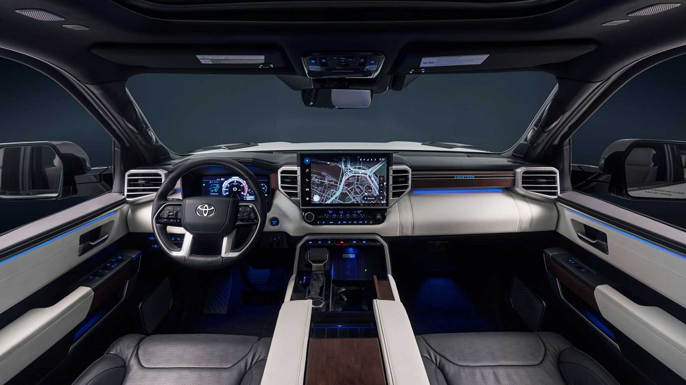 Enterijer bi trebalo da bude napucan opremom kao što je kvalitetna koža, poveći panoramski krov, 14-inčni monitor i naravno najmodernija elektronika koju kupac može da poželi. Tundra stiže i sa posebnom stepenicom za lakši ulazak u prikolicu i vazdušnim ogibljenjem za bolju udobnost.