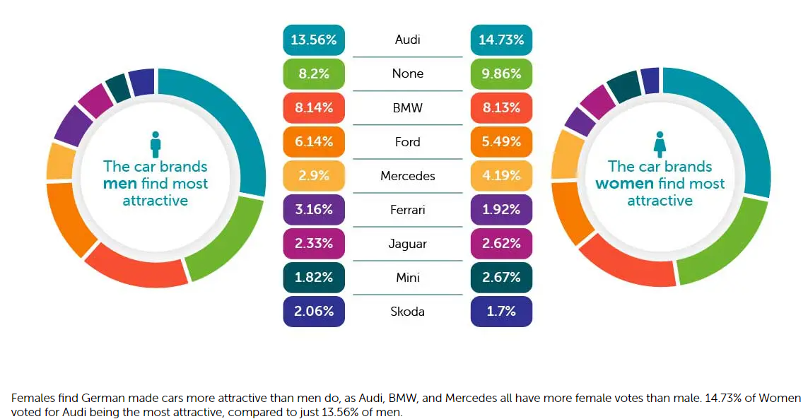 U konkretnom istraživanju je učestvovalo oko dve hiljade osoba iz Velike Britanije, a njima je upućeno pitanje o tome „koje automobile voze najzgodniji vozači“, i na osnovu odgovra tih ispitanika, došlo se do zaključka da najlepši ljudi „teraju Audi“, a što se odnosi, kako na muškarce, tako i na žene. Iza ove nemačke marke su se smestili i Ford, BMW, Mercedes, Ferrari i Jaguar.
