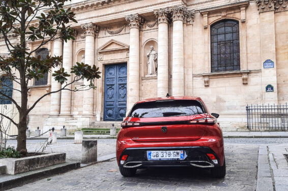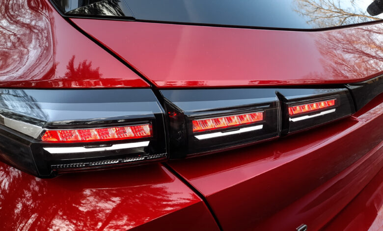 Prednja maska mnogo je veća nego li kod nekadašnje 308-ice, sada s dobro poznatim „očnjacima“ od 30-aak santimetara. Nije zaboravljen ni zadnji deo, lažna dupla izduvna grana se podrazumeva, kao i tri predivna svetla u LED tehnologiji, zakamuflirana u crnoj horizontalnoj lajsni. Pažnja, nisu ista kod svih verzija (prednja isto tako), kod prethodno voženog 308 Hybrid Plug-in GT Pack su blago zakošena i sofisticiranija, dok su kod Allure i slabijih verzija jednostavnija i horizontalno postavljena.